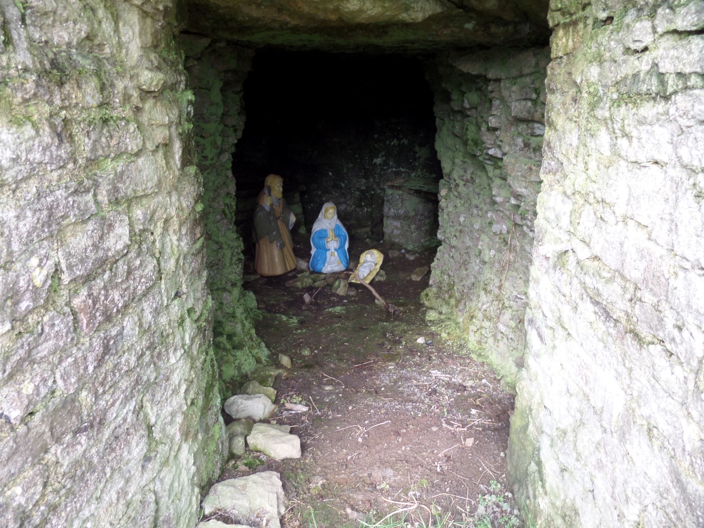Of particular interest are an ancient row of pig sties, with their ingenious feeding system, and a nativity scene in an old grotto, in the bank under an old tree. The grotto is thought to have been a medieval ice house, to keep dairy products fresh.