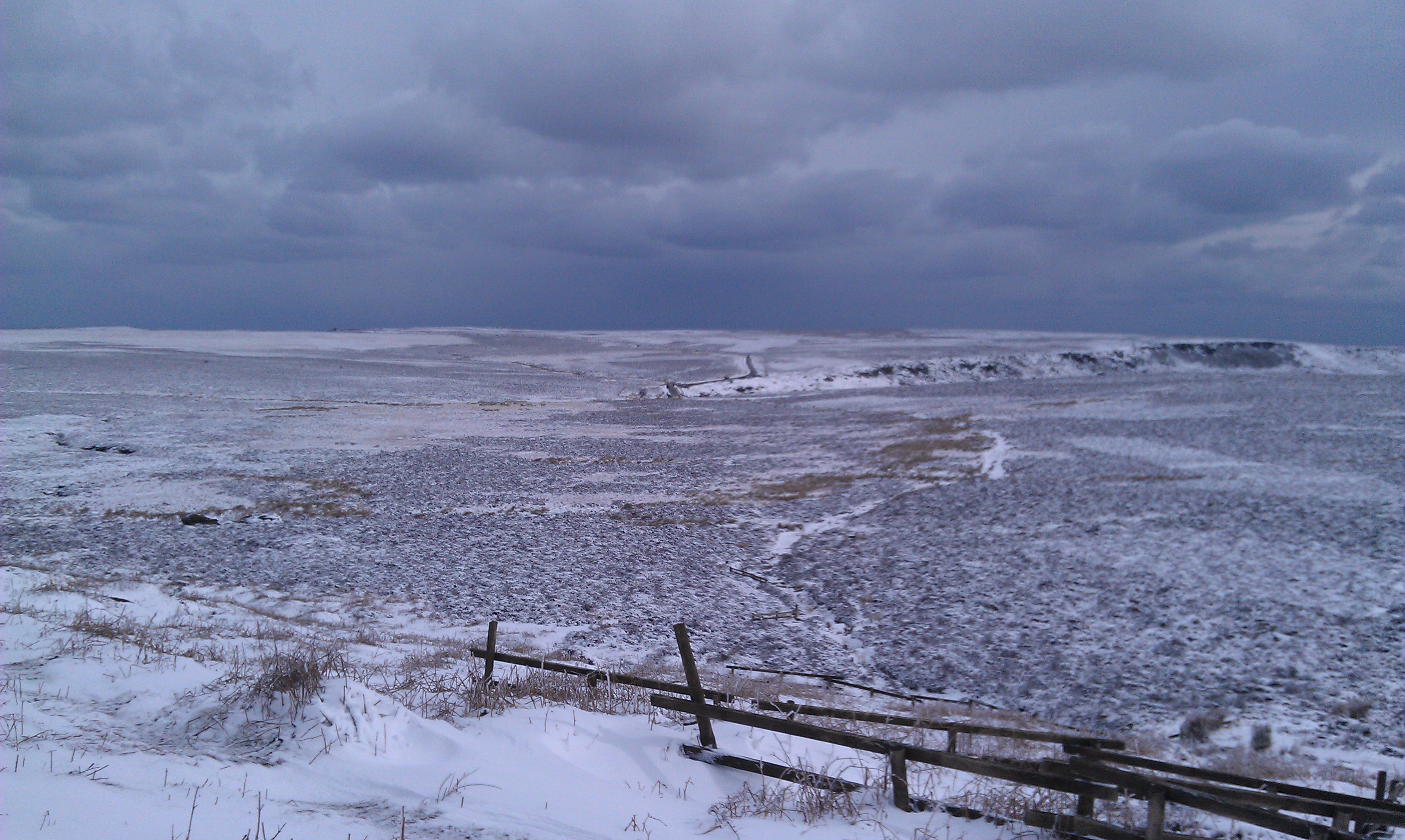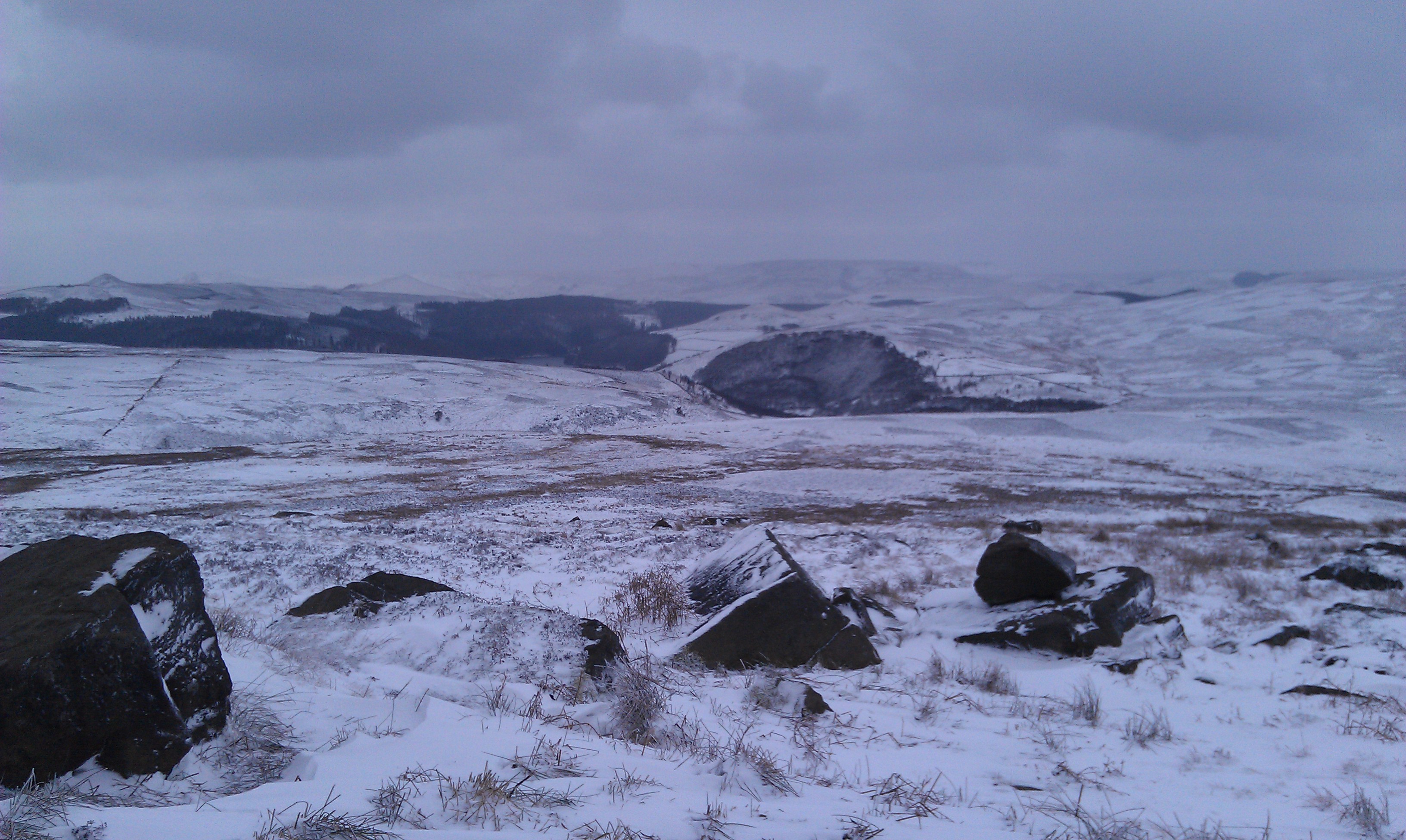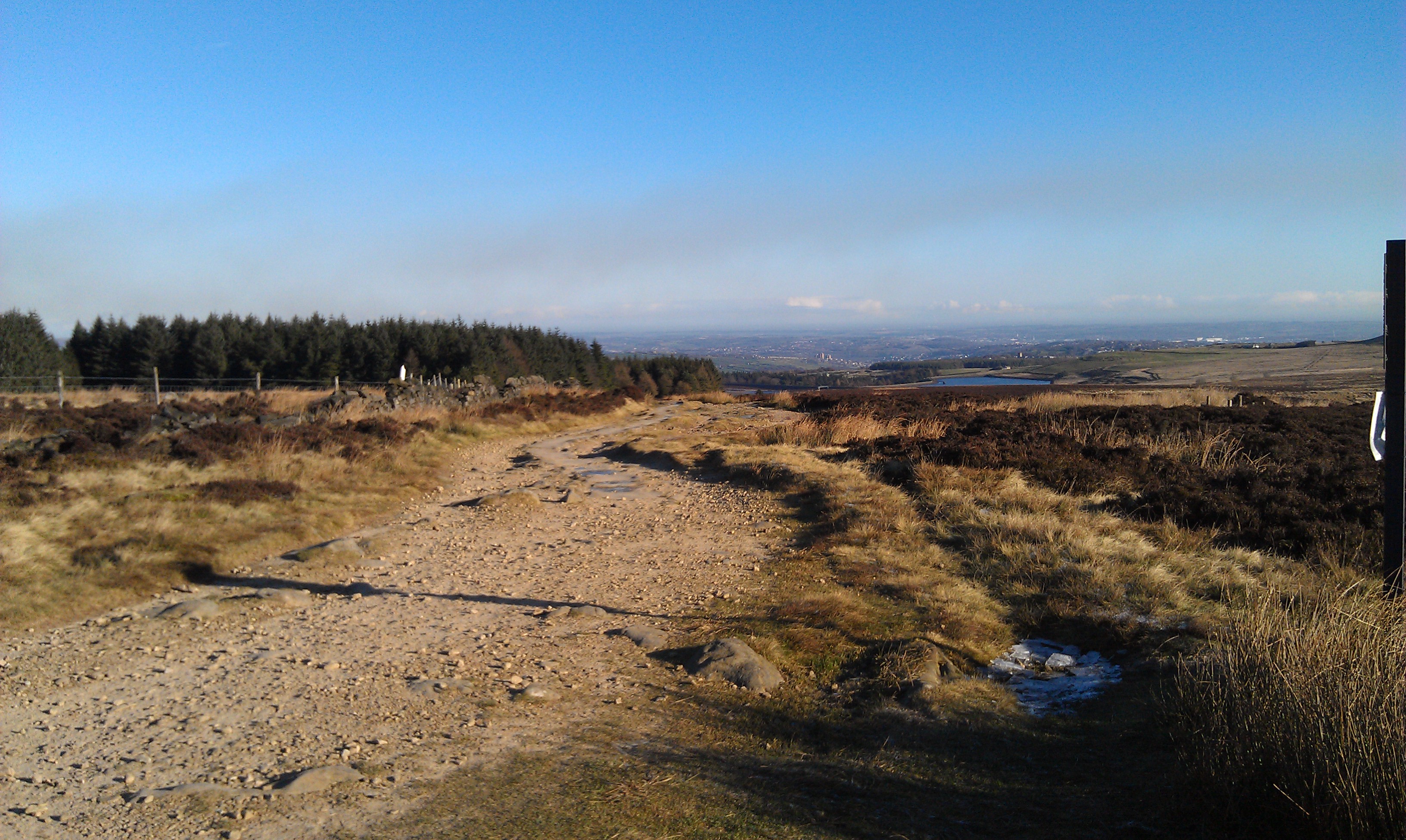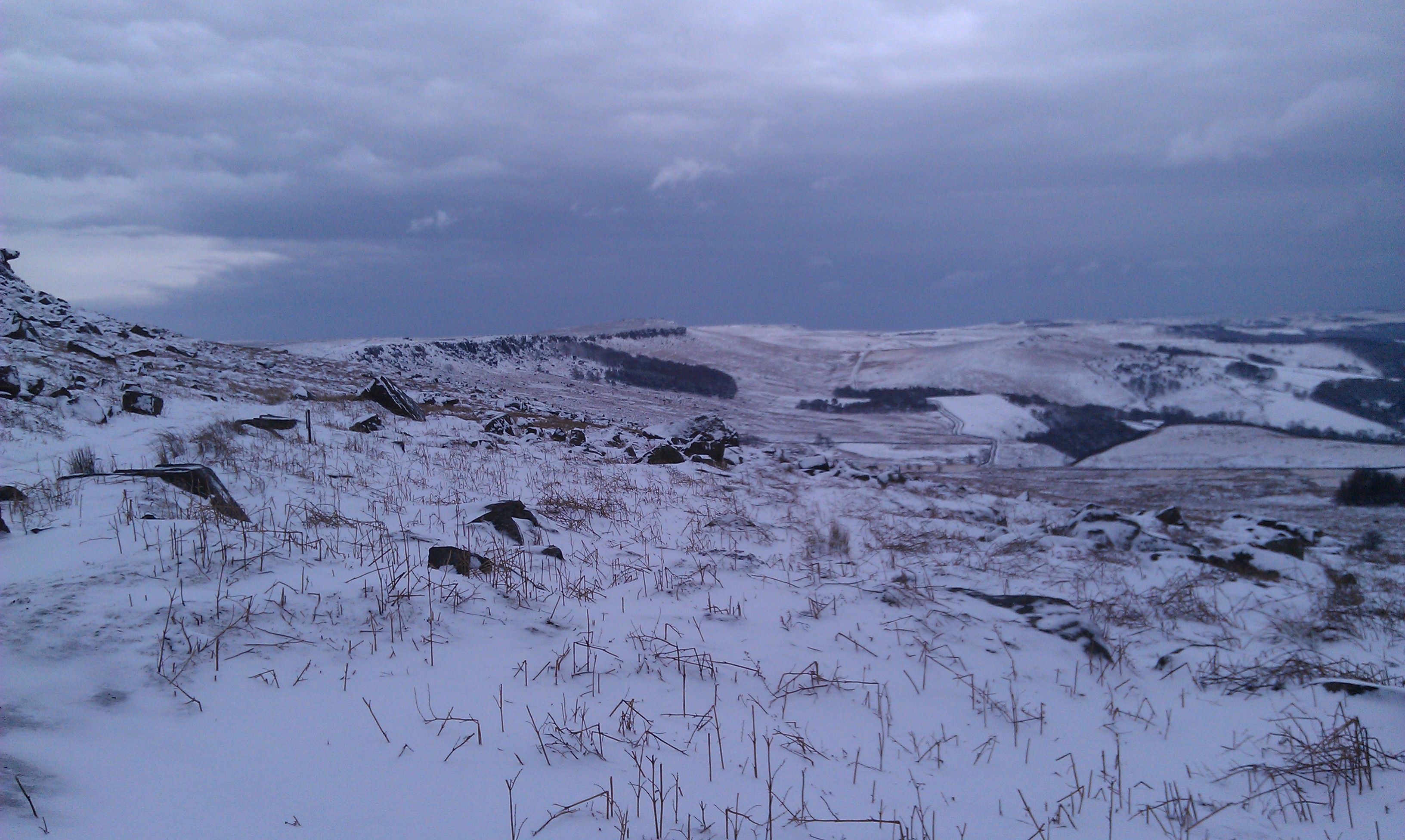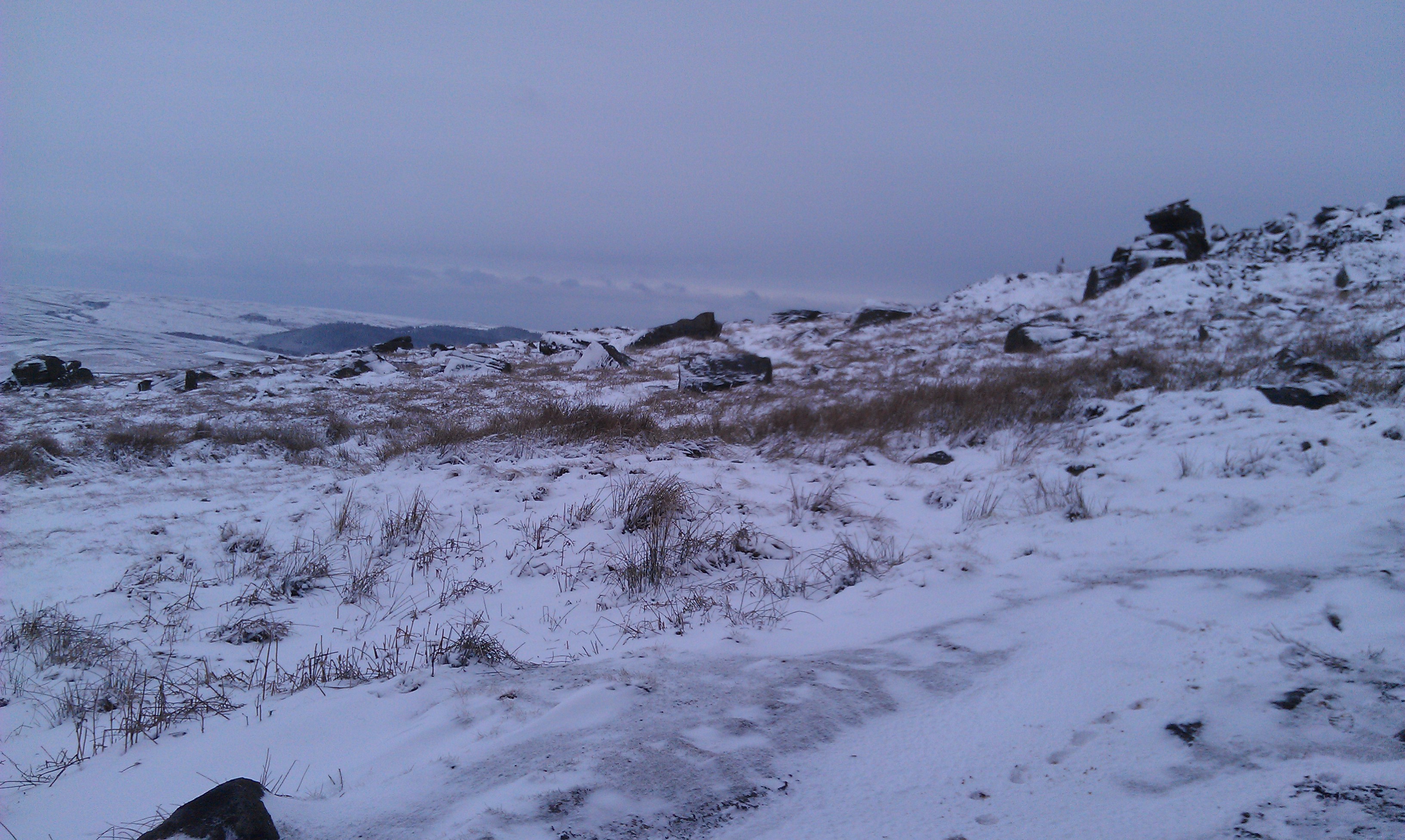 As the road flattens out bear right and walk along the top of the crag along the Sheffield Country Walk feeling every bit of the cold wind blowing down from the Arctic across White Path Moss.
