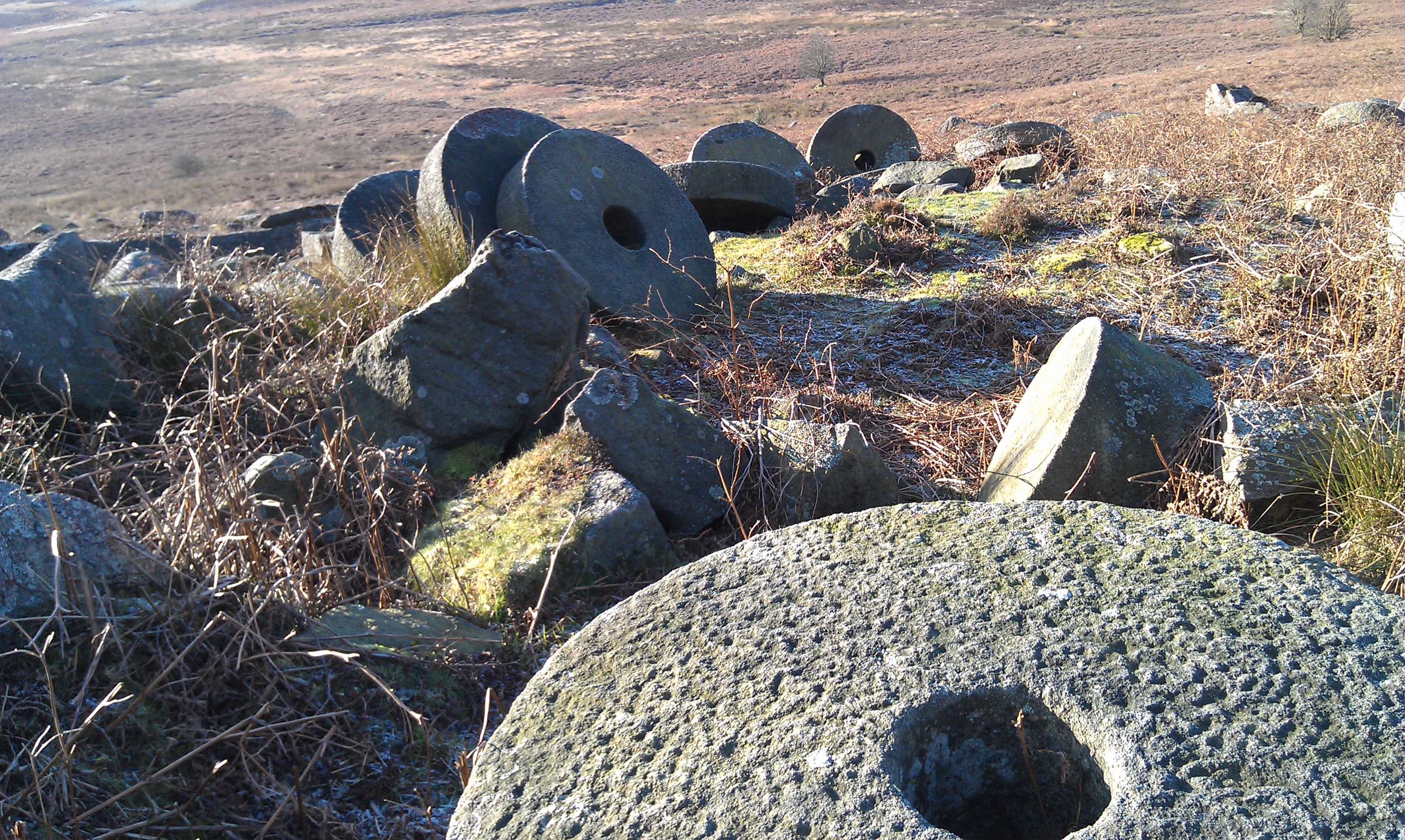 Follow the underside of the Edge alongside Moscar Moor and round the bend at Crow Chin, and admire the many, many mill stones left scattered around, in various states of preparation.
