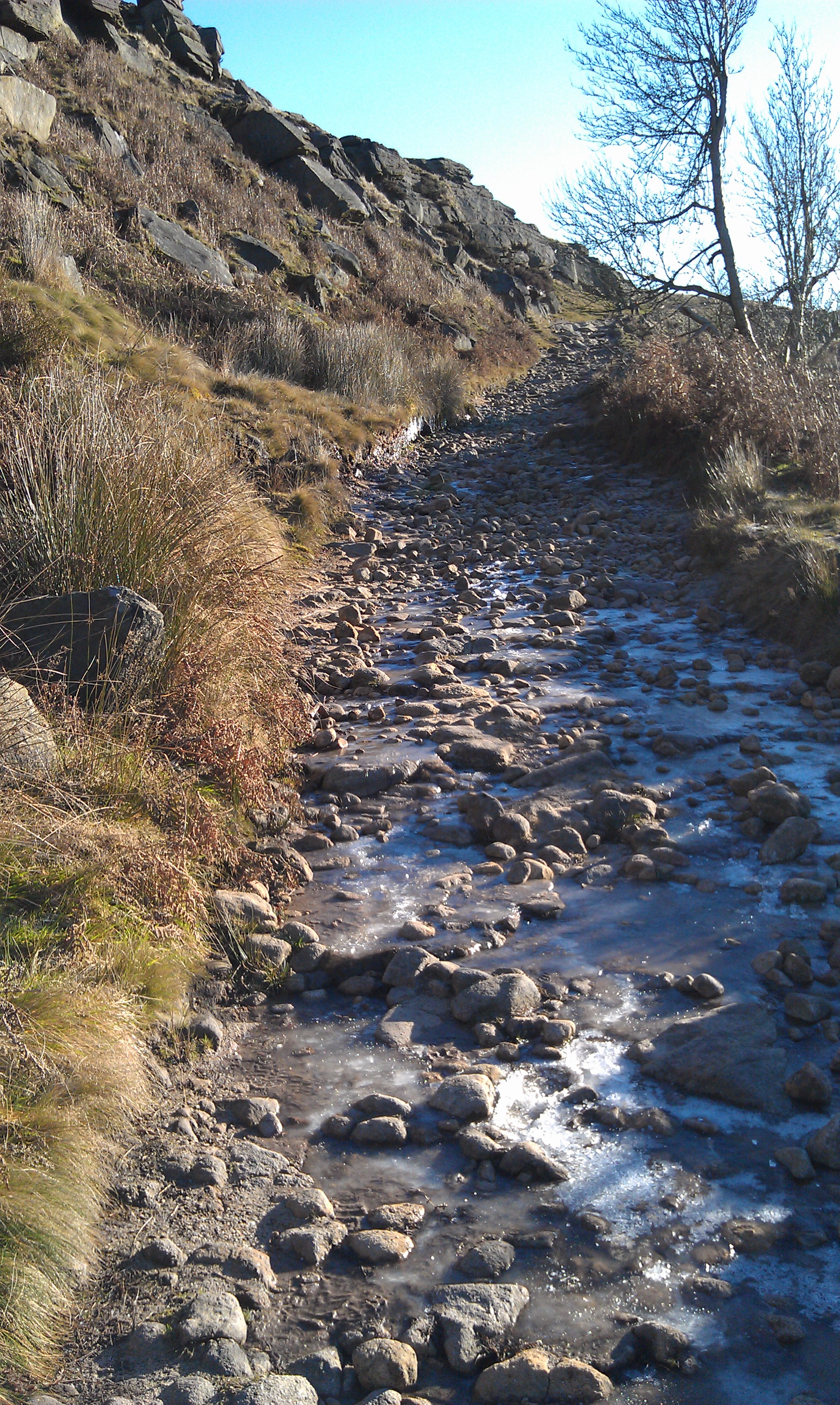 After climbing up over Cowper Stone drop down and cross over Upper Burbage Bridge and then head down the Burbage Valley under Burbage Rocks.